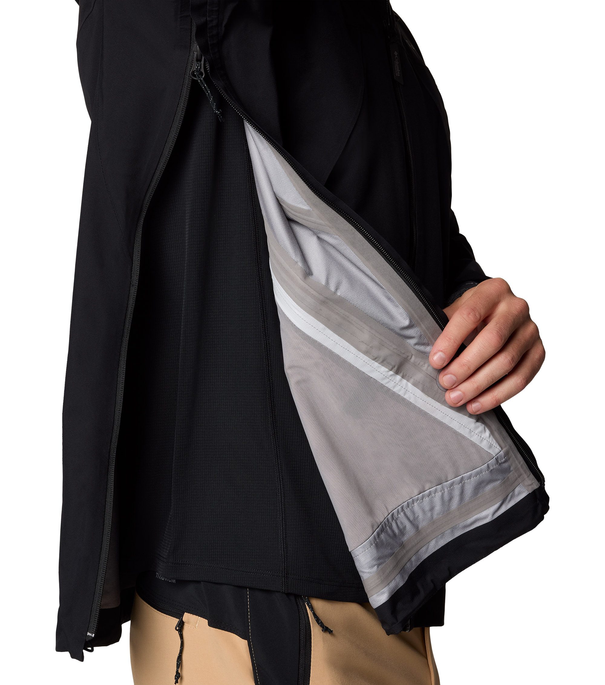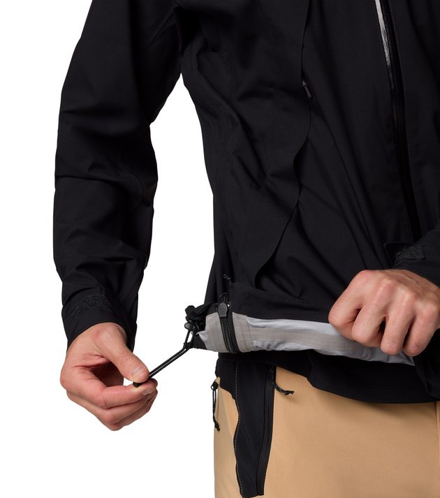 Two-way underarm zippers open to the hem for venting and the ability to wear the shell over a backpack.