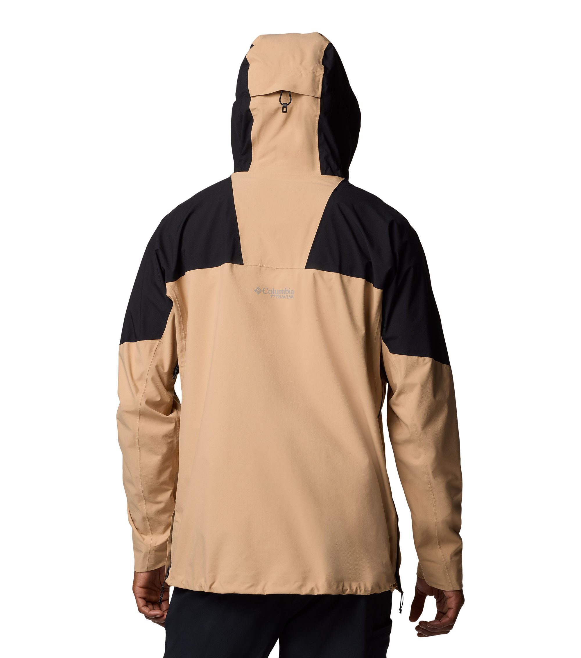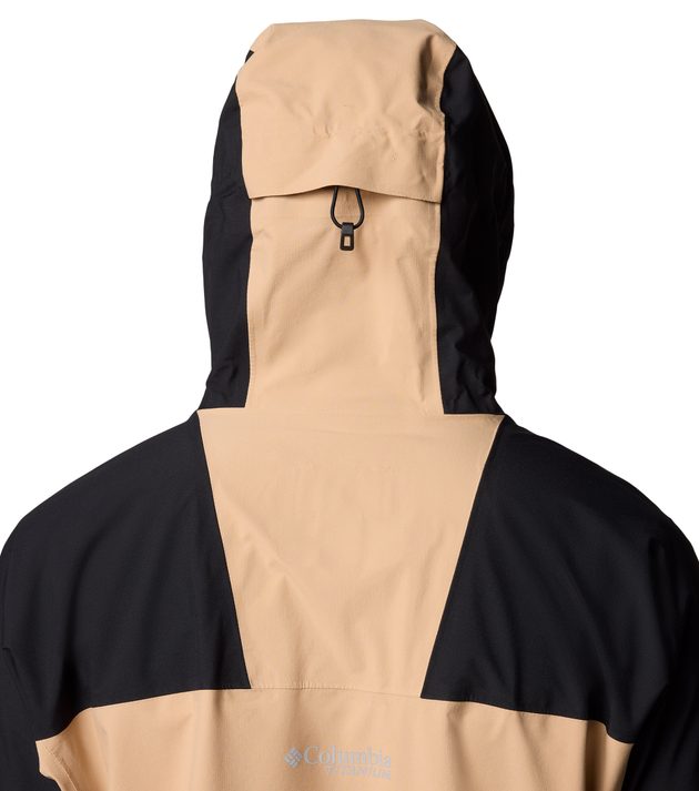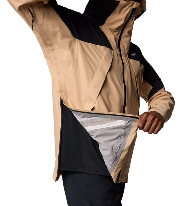 Two-way underarm zippers open to the hem for venting and the ability to wear the shell over a backpack.