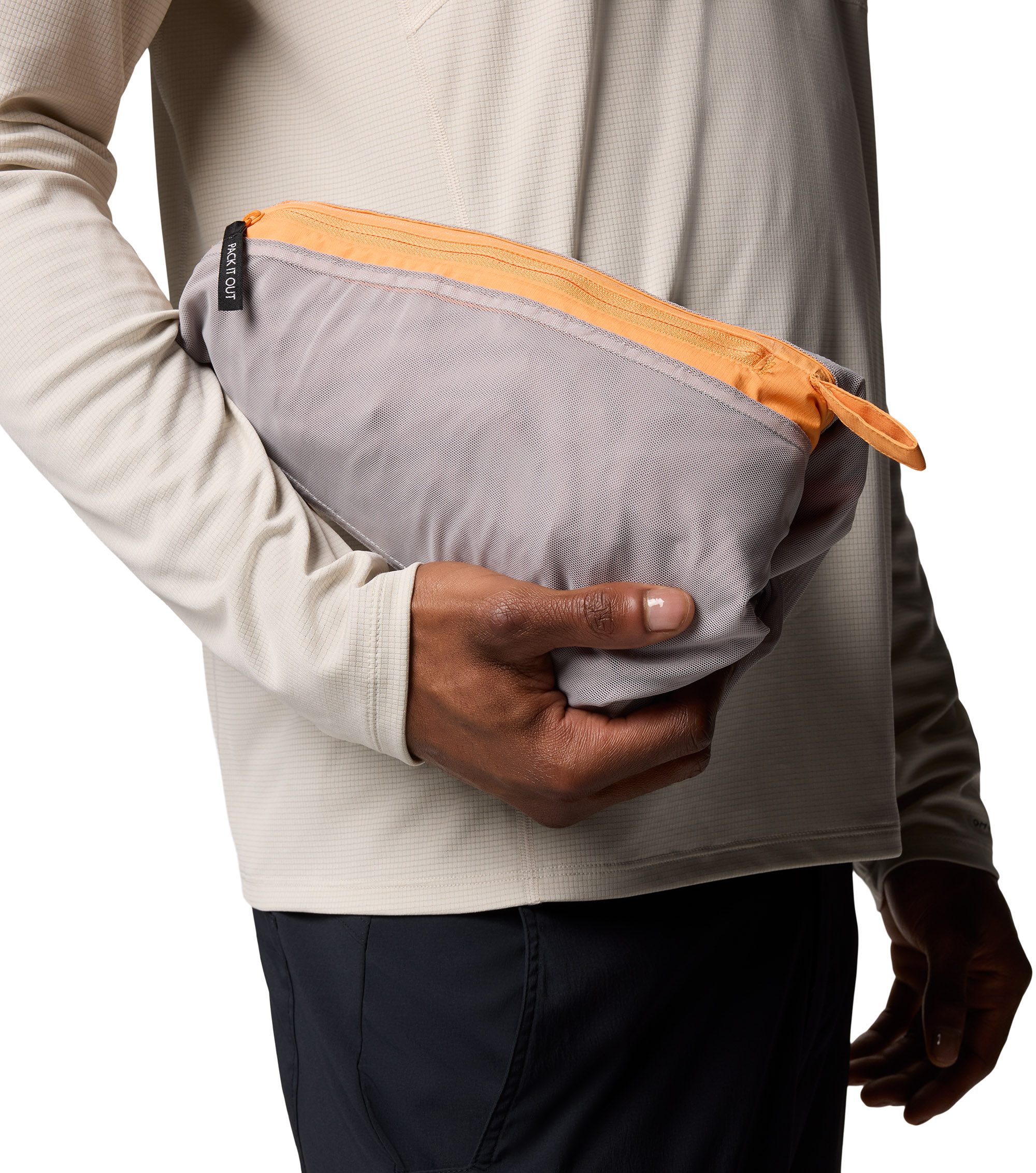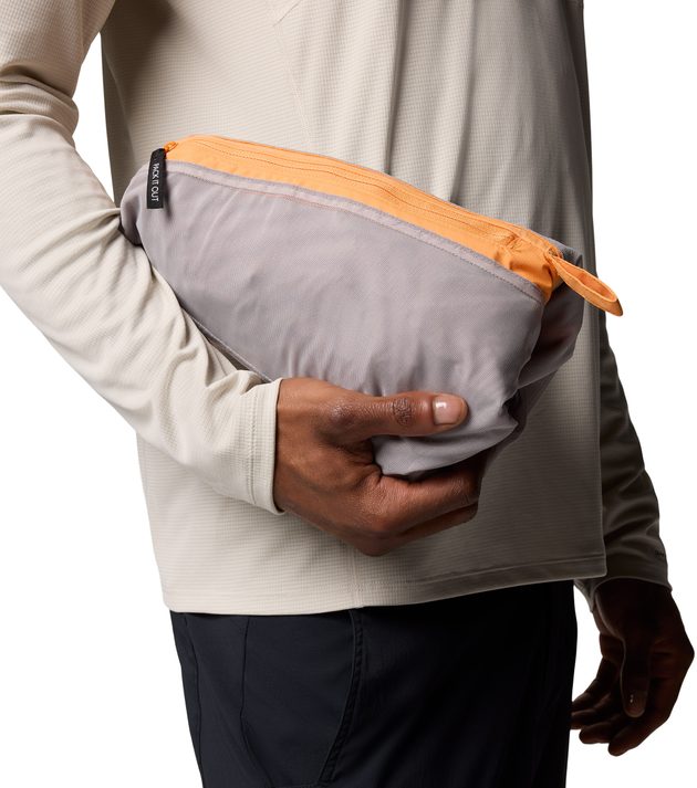 The whole jacket packs into one of the hand pockets: turn packable pocket inside out, stuff jacket inside, zip up, and go.