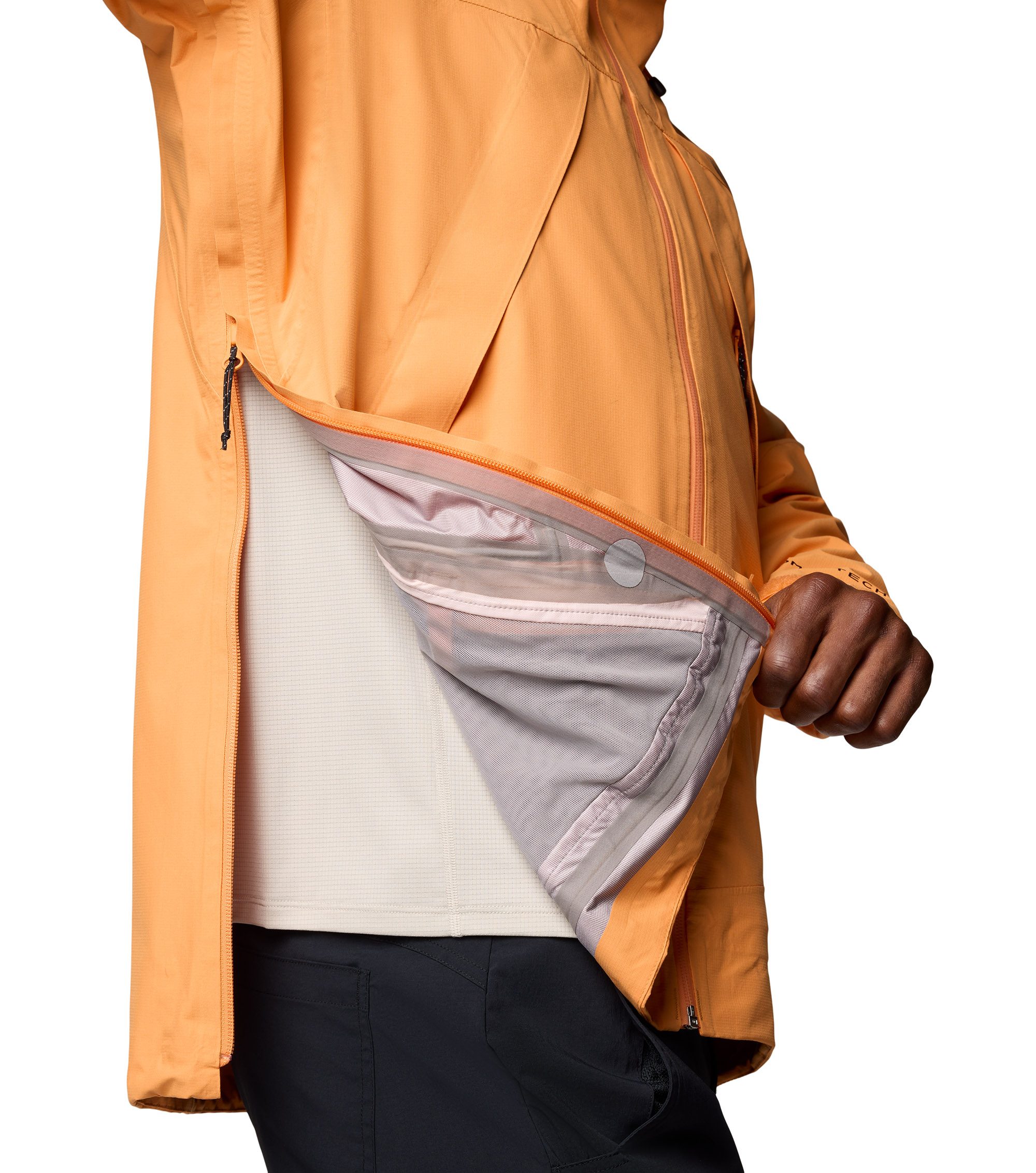 Two-way underarm zippers open to the hem for venting and the ability to wear the shell over a backpack.