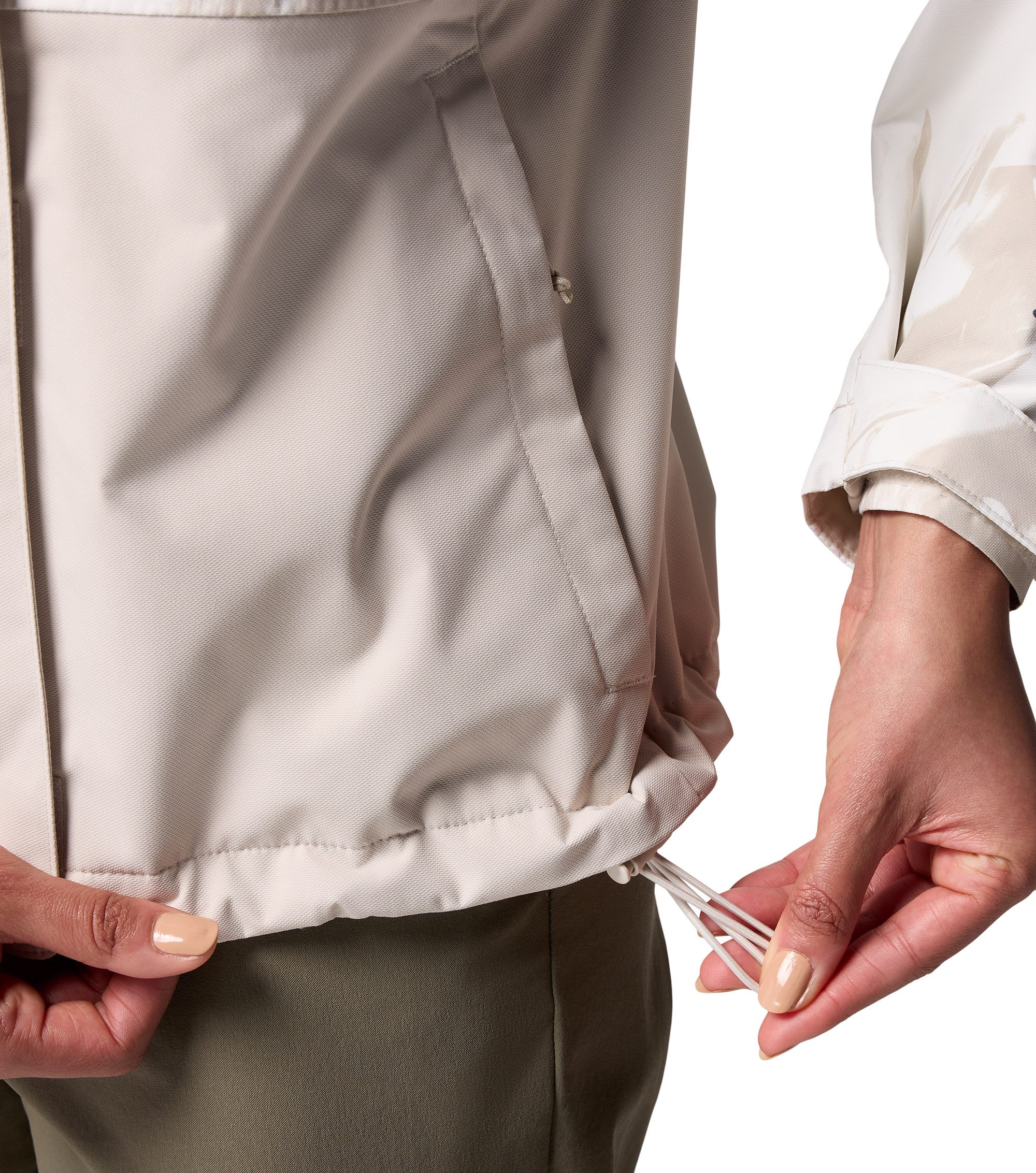 - Drawcord-adjustable hood and hem seal out the elements